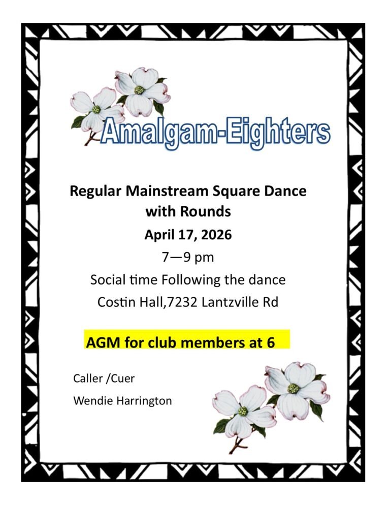 April 17. —————————Regular Dance AGM @6 pm
